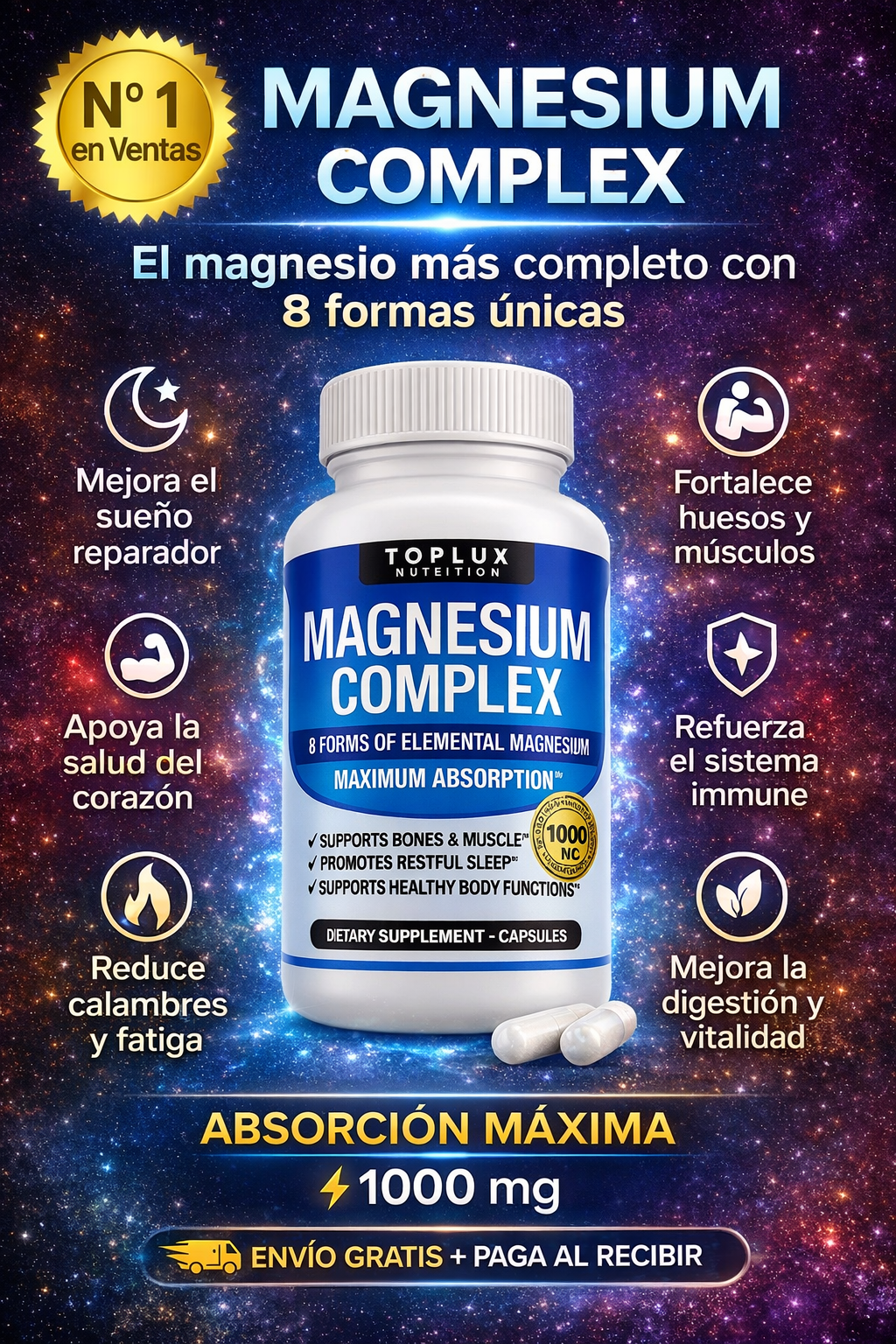 El Magnesio Complex aporta 8 formas de magnesio de alta absorción que ayudan a mantener la energía diaria, favorecer un descanso reparador, apoyar la relajación muscular y contribuir al bienestar de huesos y articulaciones.